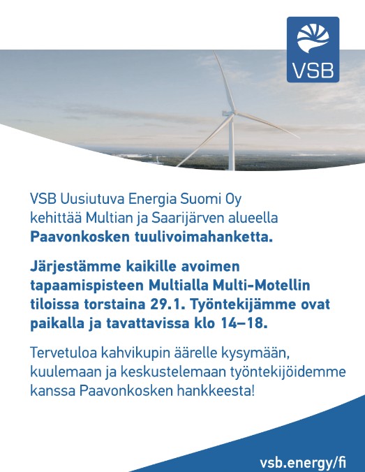 VSB Uusiutuva Energia Suomi Oy kehittää Multian ja Saarijärven alueella Paavonkosken tuulivoimahanketta.